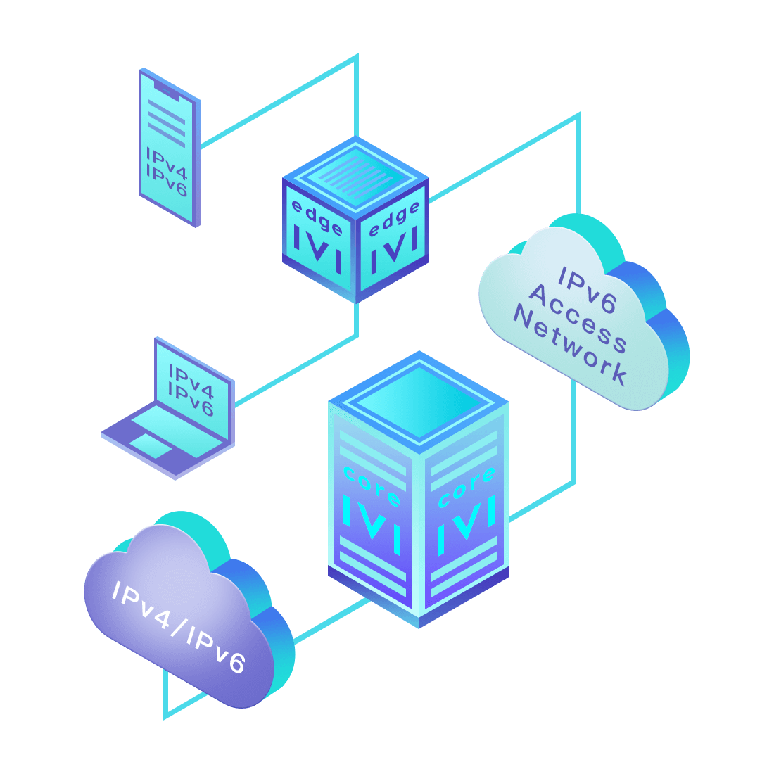 對(duì)正在進(jìn)行IPv6整體升級(jí)規(guī)劃的運(yùn)營(yíng)商,應(yīng)用IPv6升級(jí)方案2.5,通過(guò)IVI無(wú)狀態(tài)翻譯技術(shù)和純IPv6接入網(wǎng)絡(luò),為雙棧客戶端和雙棧服務(wù)器提供連通服務(wù)。